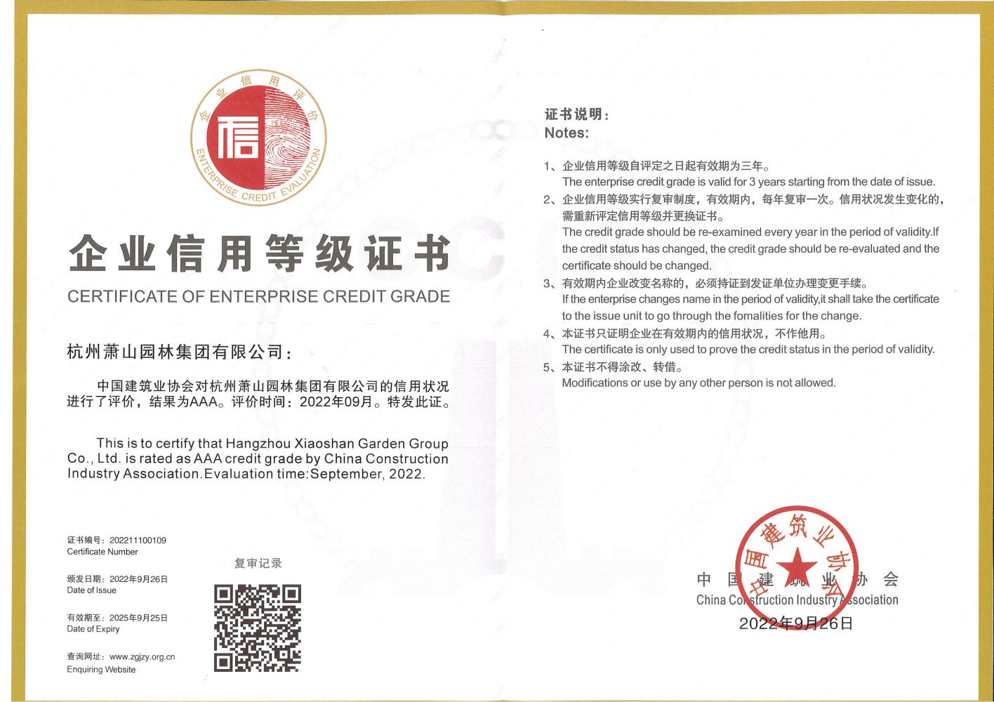 中國建筑業(yè)協(xié)會信用等級AAA級證書